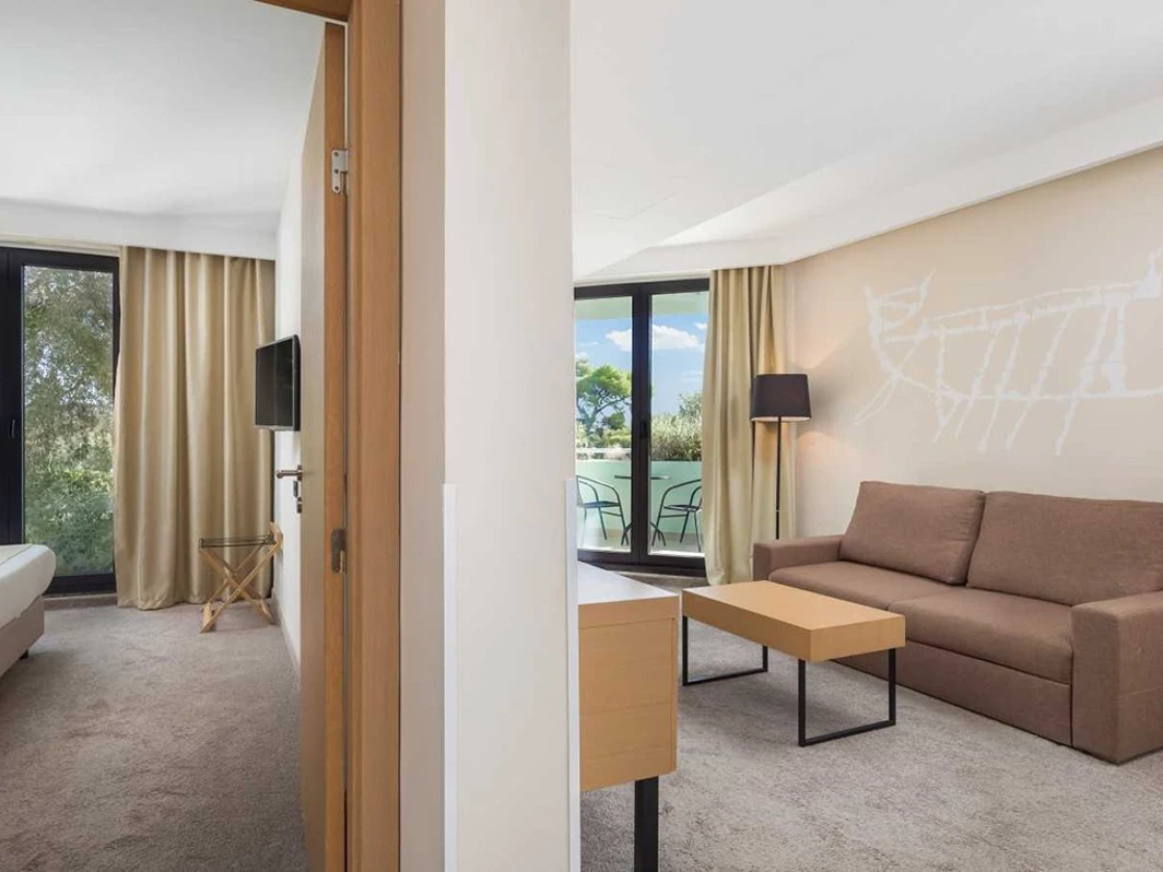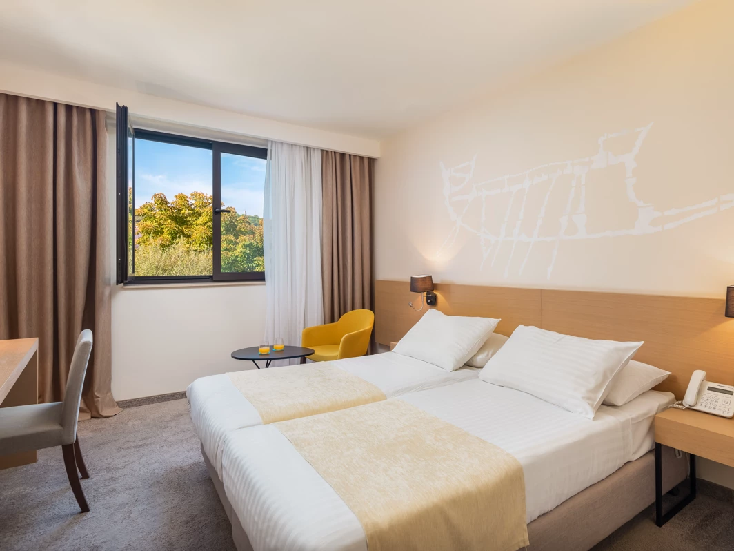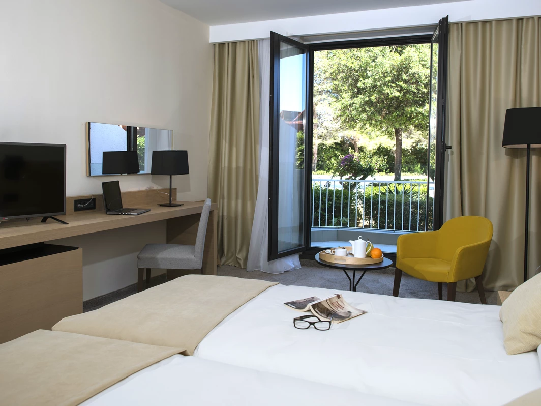 Renovirane standardne i superior sobe uređene su moderno i funkcionalno. Svaka soba sadrži kupatilo sa tušem i fenom, SAT TV, mini-bar, sef, klimu i besplatan Wi-Fi. Deo soba ima balkon s predivnim pogledom na more ili okolnu prirodu. Usluga je na bazi noćenja sa doručkom. Kamenita, delom betonirana plaža udaljena je oko 50 metara od hotela, a ležaljke i suncobrani dostupni su uz doplatu.