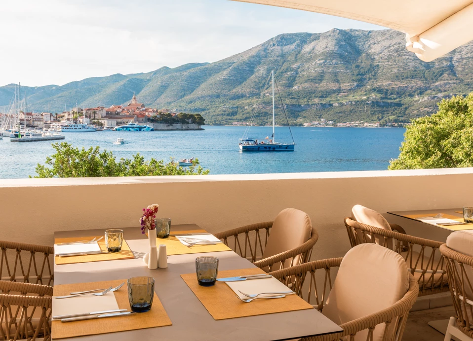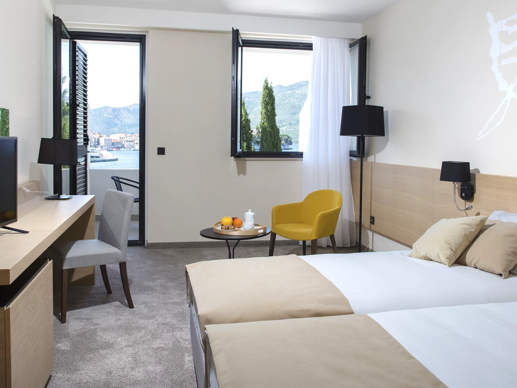 Hotel se nalazi na jednoj od najlepših pozicija u Korčuli – u mirnom okruženju, a opet nadomak centra grada. Gostima su na raspolaganju glavni restoran, à la carte restoran, lobby bar, pool bar i terasa sa otvorenim bazenom. U okviru hotela nalaze se i prostorija za bicikle, dva zemljana teniska terena, TV sala, dnevni boravak i suvenirnica. Tokom letnje sezone, dva puta nedeljno organizuje se živa muzika na terasi. Parking je dostupan uz doplatu, a gosti mogu koristiti wellness sadržaje u obližnjem hotelu Marko Polo.